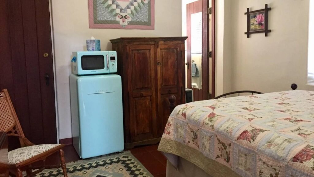 Originally the servant’s quarters, the Quilt Room is situated adjacent to the main house and enjoys a private entrance and courtyard patio. The queen bed is covered by a vintage quilt and the mesquite cupboard holds meal essentials. The nearby antique tea table is coffee central and the retro refrigerator and microwave add to the room‘s appeal. The sunny bathroom with walk-in shower overlooks the central courtyard to the main ranch house. This room without kitchen blends western character with vintage charm and is sure to please.
